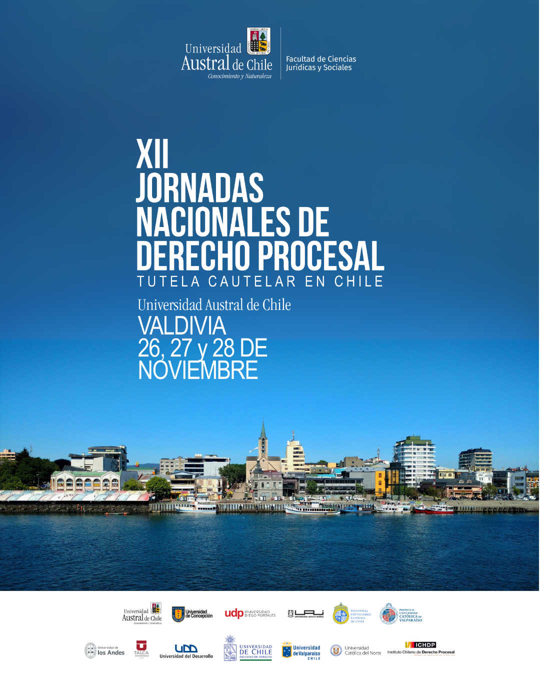 Las Jornadas Nacionales de Derecho Procesal son el evento de temático procesal más antiguo e importante de nuestro país, organizado por un consorcio de doce Facultades de derecho en conjunto con el Instituto Chileno de Derecho Procesal (ICHDP). El 2025 compete su organización a la Universidad Austral de Chile. Se realizarán en la sede de Valdivia durante los 26, 27 y 28 de noviembre y desarrollarán siguiendo el eje temático de “La tutela cautelar en Chile” En su permanente afán por contribuir al desarrollo del conocimiento y resolver problemas concretos de la práctica forense, la Jornadas Nacionales de Derecho Procesal se erigen como un espacio de visualización y discusión de diferentes problemáticas en el marco del proceso. Habrá cinco mesas temáticas que abordarán los principales desafíos del proceso en materia civil, familia, penal, laboral, y contencioso-administrativo y de justicia ambiental. Habrá, además, una mesa destinada exclusivamente para estudiantes.