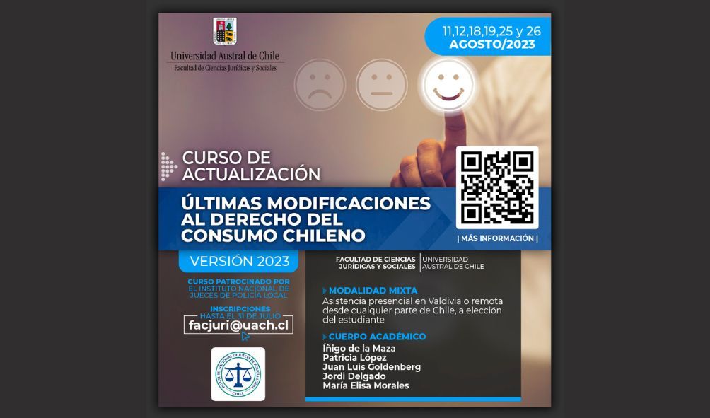 Valdivia, 6 de julio de 2023.- El próximo 31 de julio cierran las inscripciones al curso de actualización «Últimas modificaciones al Derecho del Consumo Chileno», preparado, en modalidad presencial y remota, por la Facultad de Ciencias Jurídicas y Sociales de la Universidad Austral de Chile y cuenta con el patrocinio del Instituto Nacional de Jueces de Policía Local.