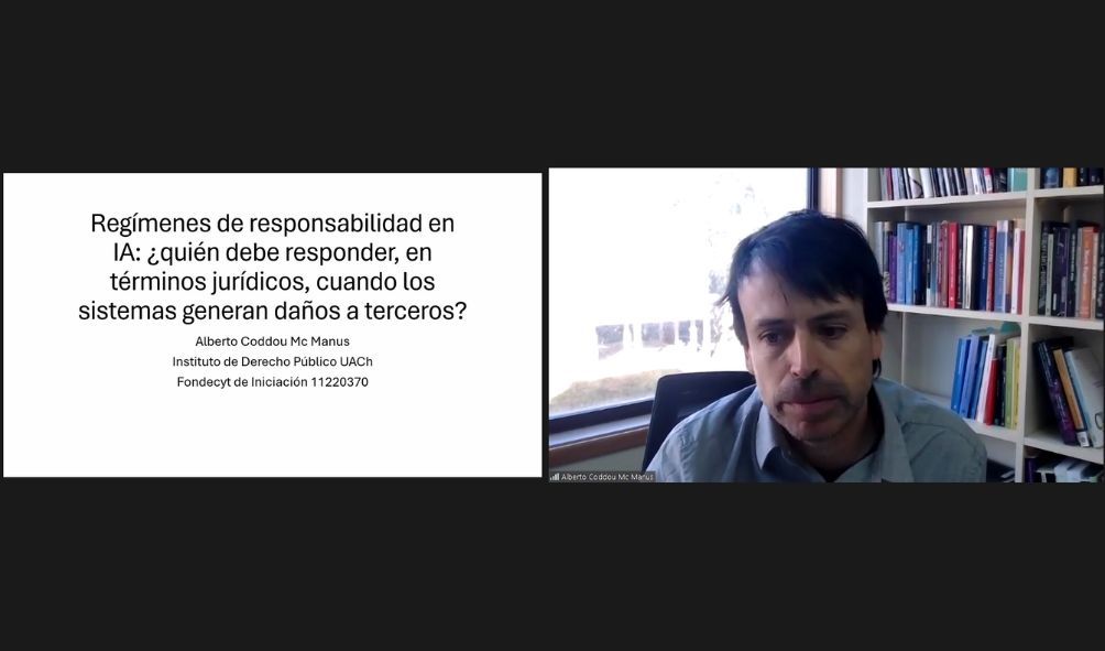 Valdivia, 20 de marzo de 2024.- «Regímenes de responsabilidad en IA: ¿quién debe responder, en términos jurídicos, cuando los sistemas generan daños a terceros?», se tituló la ponencia a cargo del Dr. Alberto Coddou, profesor del Instituto de Derecho Público de la Facultad de Ciencias Jurídicas y Sociales UACh, en el marco del «Workshop IA generativa: impacto y desafío en la cuestión legal», organizado por la Facultad de Derecho de la Universidad Adolfo Ibáñez.